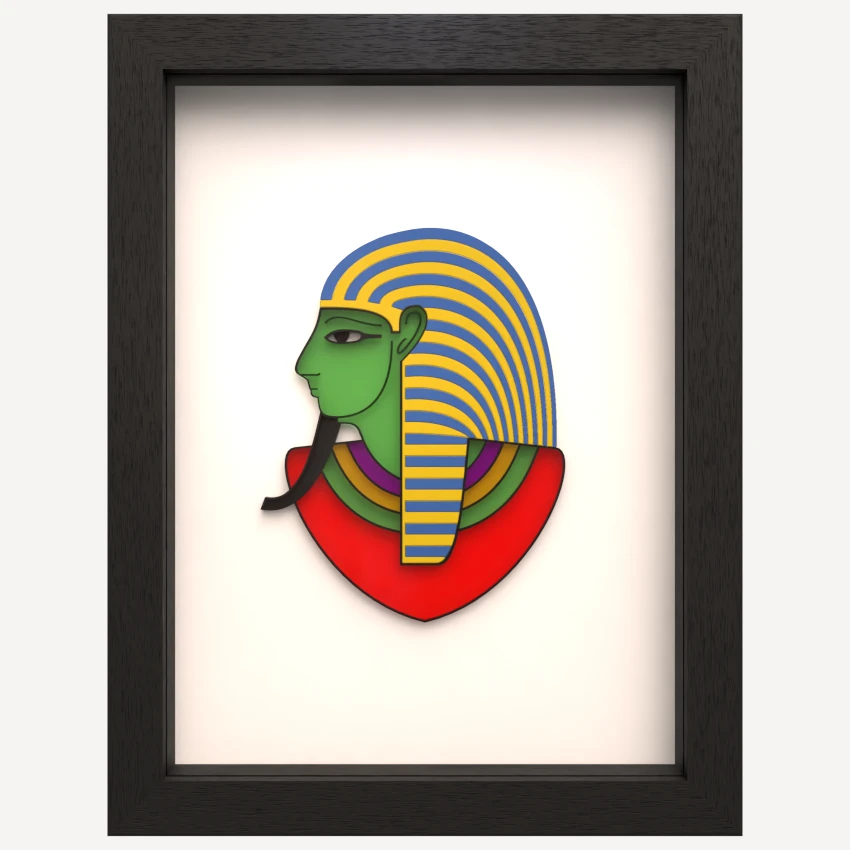 Das alt-ägypthischer Motiv besticht durch eine grelle Farbvielfalt und besitzt dennoch durch die leuchtfarbenden Resin (Kunstharz) Elemente in Kombination mit der matten Charakteristik 3d-gedruckter Formen (Kopftuch) einen harmonischen, ausgeglichenen Ausdruck.